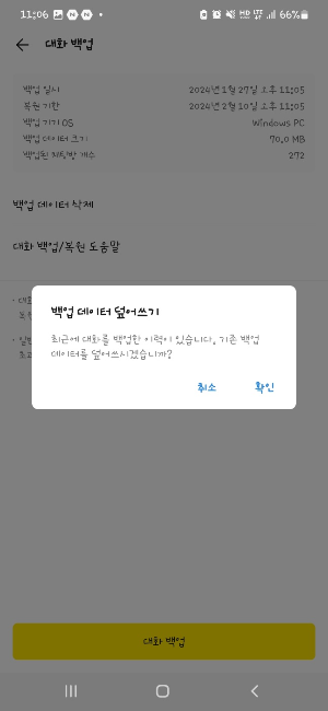 4. 업로드가 끝나면 대화 내용이 백업되며 이동할 기기에 백업한 아이디와 같은 아이디로 로그인 후 복원을 누르면