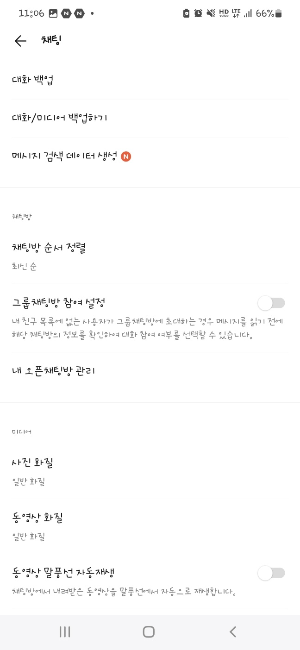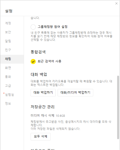 2. 채팅 클릭 후 아래로 내리면 대화 백업 부분이 있습니다.