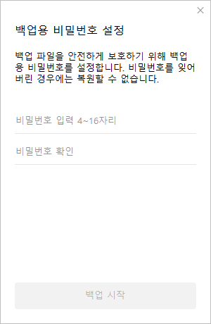 3. 원하는 백업 방법을 선택 후 백업 버튼을 클릭, 백업용 비밀번호를 입력 후 백업 시작을 누릅니다.